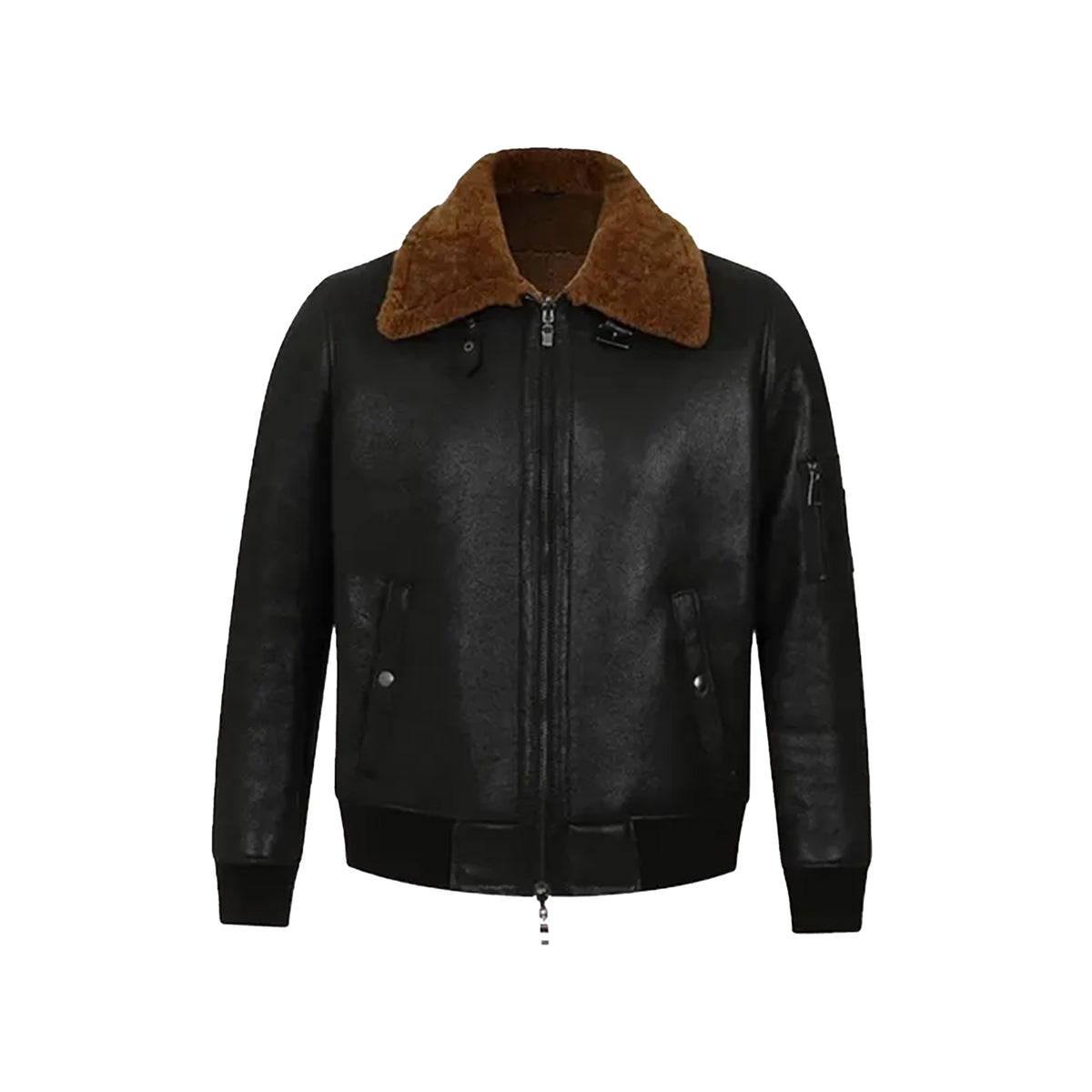Step into timeless style with the men's black shearling bomber jacket from Lush Gear. This jacket offers excellent warmth with its genuine shearling collar. The exterior features smooth black leather. It stands out with classic bomber details and clean lines. This men's black shearling bomber jacket feels soft and sturdy. The shearling trim keeps your neck warm during colder months.